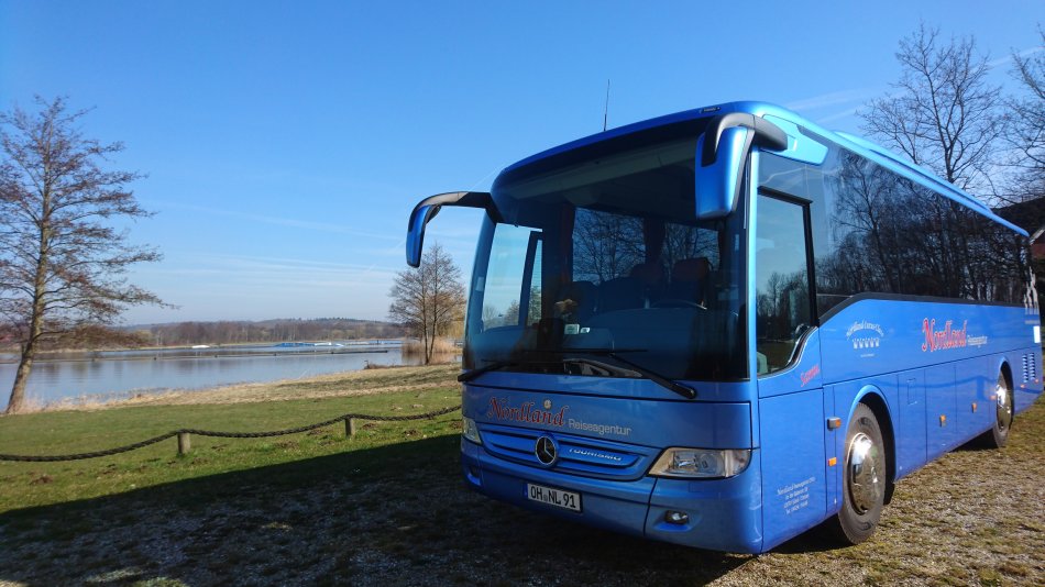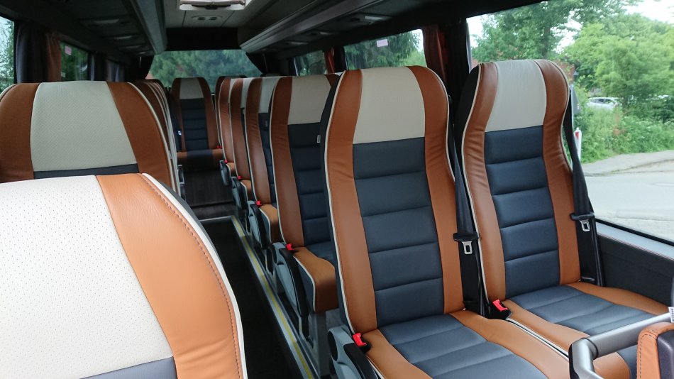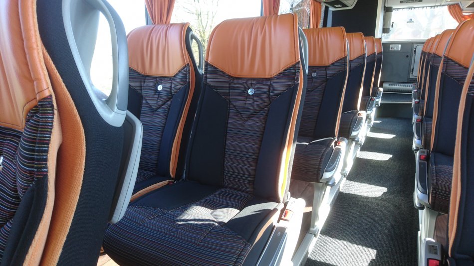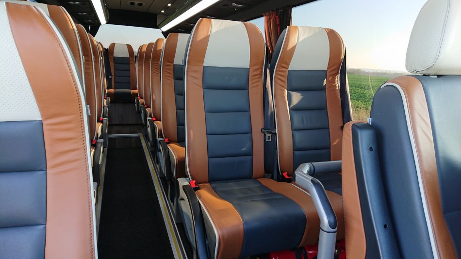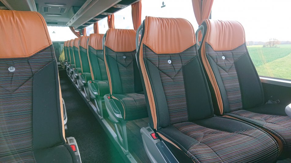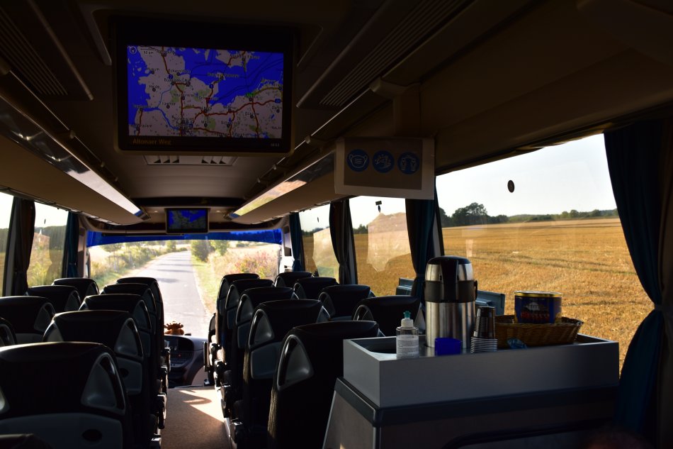 Bequeme Reisebestuhlung mit mind. 81cm Sitzabstand, an allen Plätzen Sicherheitsgurte, Tische, Fußrasten Leselampen, Armlehnen, Klimaanlage, CD-+DVD-Anlage, Bordküche, Kühlschrank, WC & Waschraum