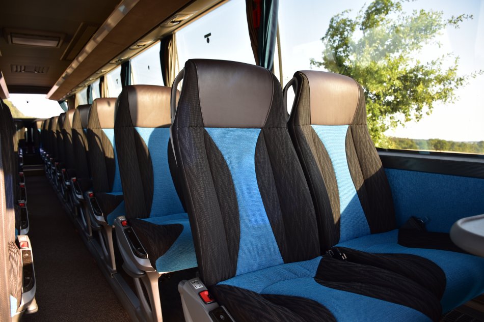 Bequeme Reisebestuhlung mit mind. 74cm Sitzabstand, an allen Plätzen Sicherheitsgurte, Fußrasten, Leselampen, Armlehnen, Klimaanlage, Radio- + CD-Anlage und Kühlschrank