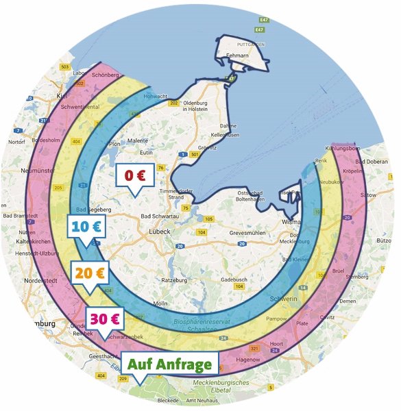 Ab einer bestimmten Distanz erlauben wir uns, einen Aufschlag für unseren Service zu erheben (sh. Übersichtskarte).