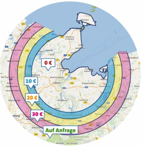 Ab einer bestimmten Distanz erlauben wir uns, einen Aufschlag für unseren Service zu erheben (sh. Übersichtskarte).